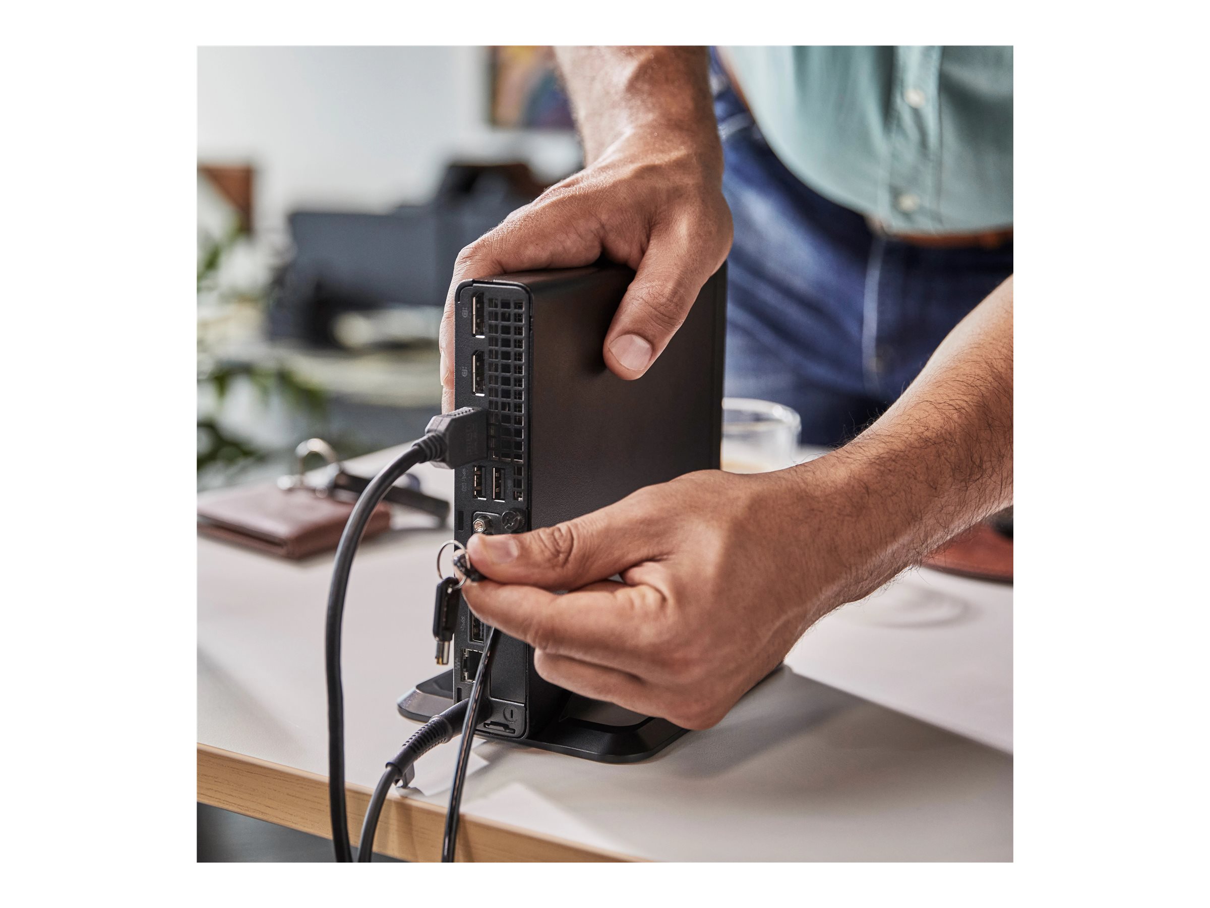 | Interface | 1 x USB-C 3.2 Gen 2x2 (1 foran) (opladning) | 5 x USB 3.2 Gen 2 (2 front, 3 bag) (to af dem med vækkefunktionalitet, en af dem er opladende) | 1 x hovedtelefoner/mikrofon (CTIA og OMTP headset support) | 2 x DisplayPort 1.4a | 1 x HDMI | 1 x LAN (Gigabit Ethernet) |