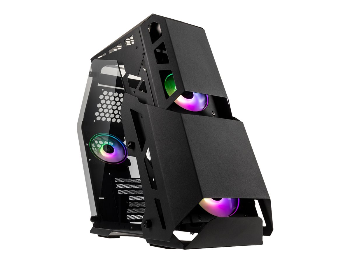| Egenskaber, systemkabinet | Understøtter 240 mm radiator i toppen, understøtter 360 mm radiator i frontpanel, ventileret PSU-slør, 2 hævede hærdet glas-sidepaneler, metalfrontpanel |