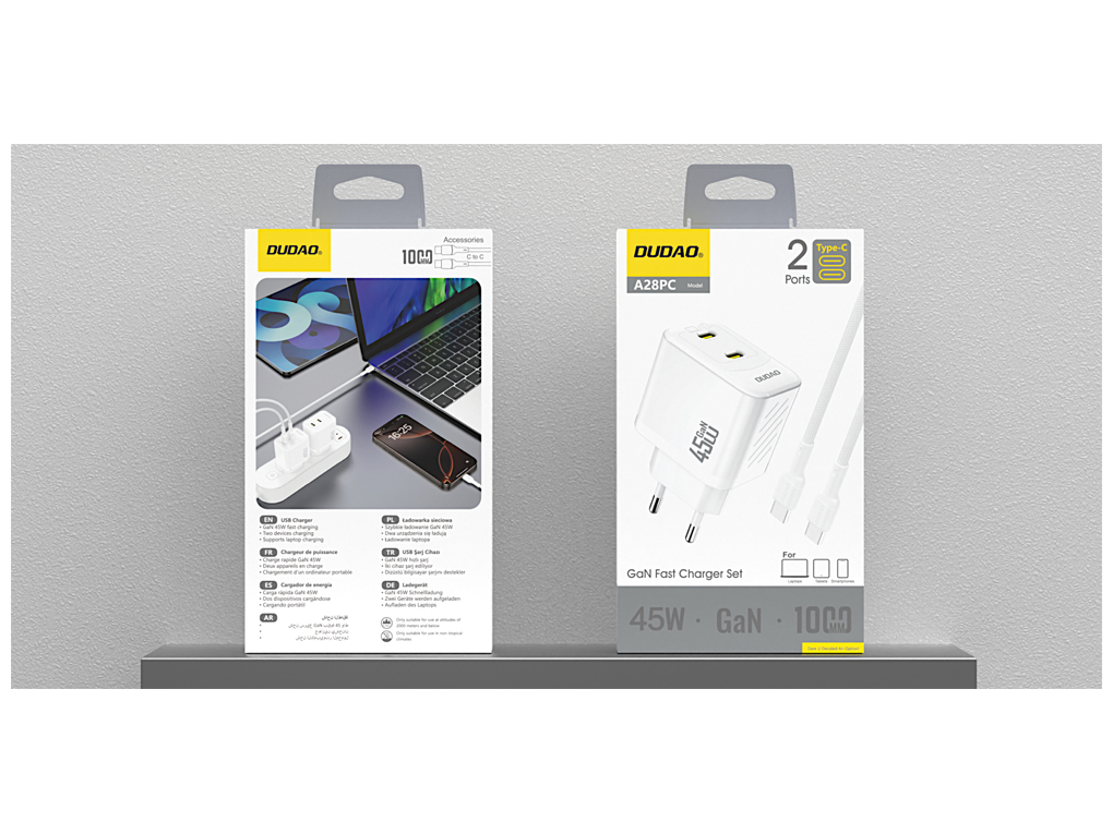 Dudao - Strømforsyningsadapter - GaN - 45 Watt - 2x USB-C - USB-C til USB-C Kabel - Europa - Hvid