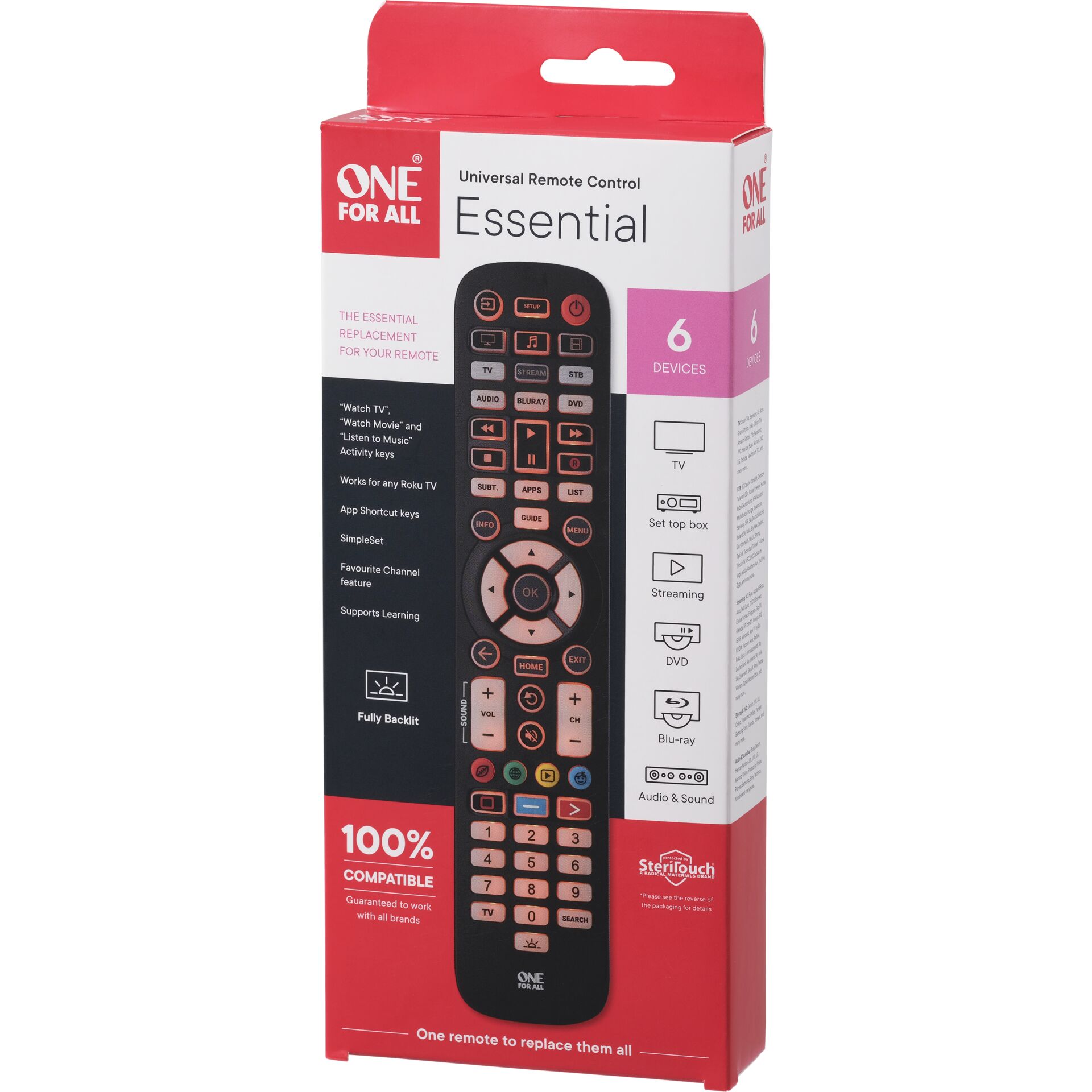 One For All Essential 6. Mærke kompatibilitet: Universel, Fjernbetjening korrekt brug: DVD/Blu-ray, IPTV, Soundbar højttaler, TV, Grænseflade: IR trådløs. Antal understøttede enheder: 6. Indgangstype: Tryk på knapper, Knapper med baggrundsbelysning
