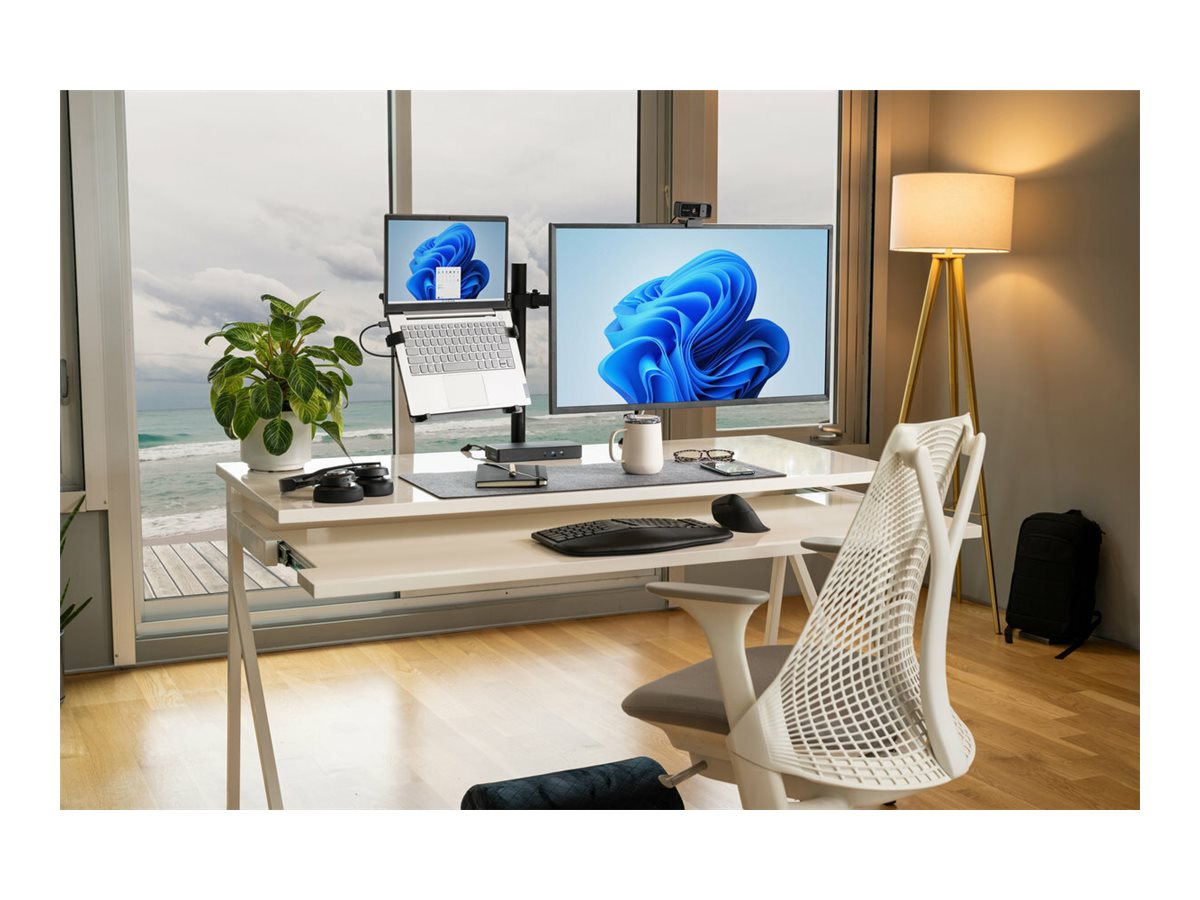 Den universelle laptop-holder til skærmarme er en stabil og sikker platform, der nemt kan monteres på enhver skærmarm med en VESA 75/100-standardplade, hæver laptoppen til øjenhøjde over skrivebordet og frigør bordplads. Understøtter laptops på op til 16" og op til 4,5 kg (9,9 lbs). Justérbare klemmer og sikkerhedstapper holder laptoppen på plads og forhindrer den i at glide. Et åbent design fremmer luftcirkulationen for at køle laptoppen.