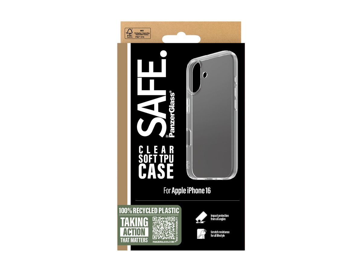 Beskyt din telefon mod selfiefumlerier, postingkatastrofer og jeg-kan-da-sagtens-tekste-mens-jeg-danser-uheld med en Soft TPU Case fra SAFE. by PanzerGlass . Den lækre, slanke, og transparente case er lavet 100 % genanvendt plast, er kompatibel med trådløs opladning og passer godt på din telefon, samtidig med at den giver dig fuld adgang til alle telefonens funktioner. Du behøver ikke engang være bekymret for misfarvninger: Casen har en blød, gennemsigtig bagside og ramme, som bliver ved med at se pæn ud, selv efter lang tids brug, masser af sollys og et hav af strandfester. Soft TPU Casen kan forlænge levetiden på din telefon, så du måske en dag kan give den videre til en anden, som vil elske den lige så højt som dig. Det er ren telefonkærlighed. For jo længere vi kan holde vores enheder i live, jo længere kan vi vente med at producere nye enheder, som belaster miljøet. Og nu vi taler om miljøet, i 2024 reducerede vi mængden af papir i vores emballager med 66 %*, og vi leverer selvfølgelig dette produkt i en genanvendelig FSC -mærket æske. Installationen er legende let. Bare klik casen på, og så er det slut med at frygte synet af din telefon med kurs mod asfalten. Det kommer muligvis aldrig til at ske, men hvis det gør, vil du fortryde, at du ikke klikkede "Tilføj til kurv". Og husk: Hvis du vil passe ekstragodt på din telefon, kan du kombinere casen med en skærmbeskytter og en kameralinsebeskytter for at give din telefon 360-graders beskyttelse. Keep your phone SAFE.