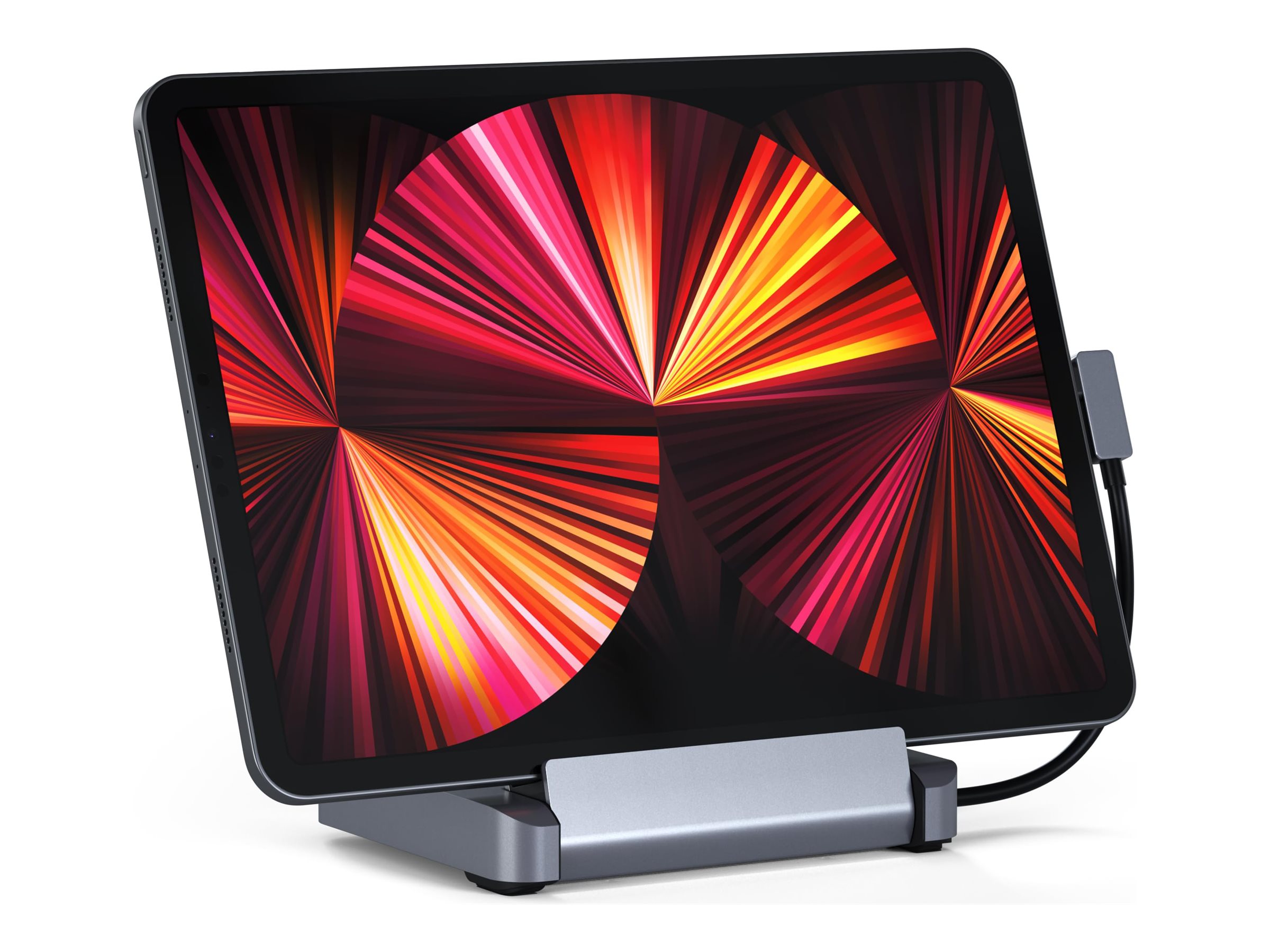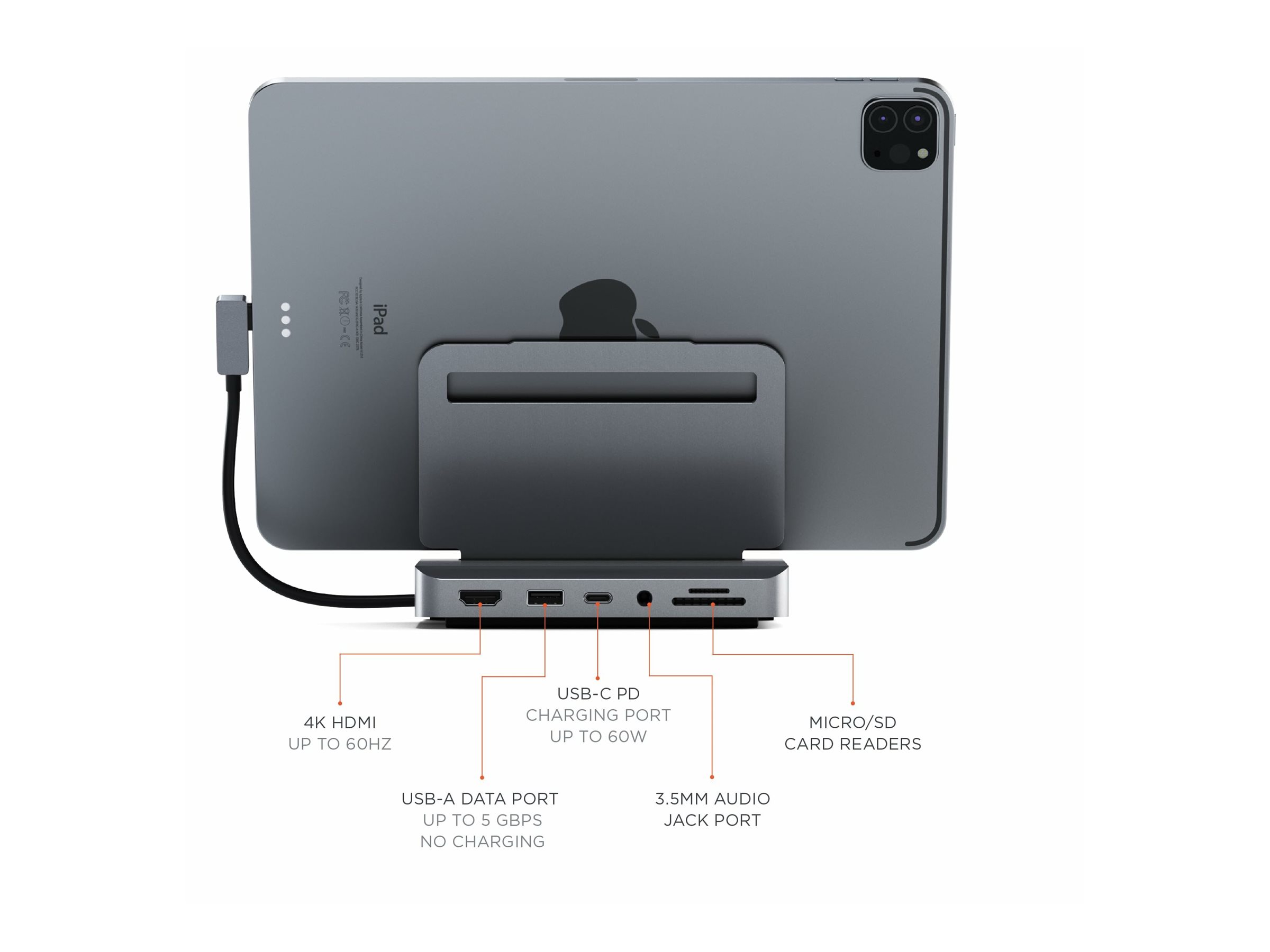 Flyt grænserne for en traditionel opsætning med Satechi Aluminum Stand & Hub til iPad Pro, der kombinerer alle funktionerne fra en stationær computer med bekvemmeligheden fra en tablet. Stativet er designet til Apple iPad Pro (2018 og nyere) og har 4K HDMI (60Hz), USB-C PD-opladning, USB-A-data, SD-kortlæsere og en lydstikport - for nem adgang til eksterne enheder, mens du løfter din iPad Pro. Med sit praktiske foldbare design og moderne aluminiumsfinish er standeren perfekt, uanset hvor du arbejder - der kræves ikke noget skrivebord.