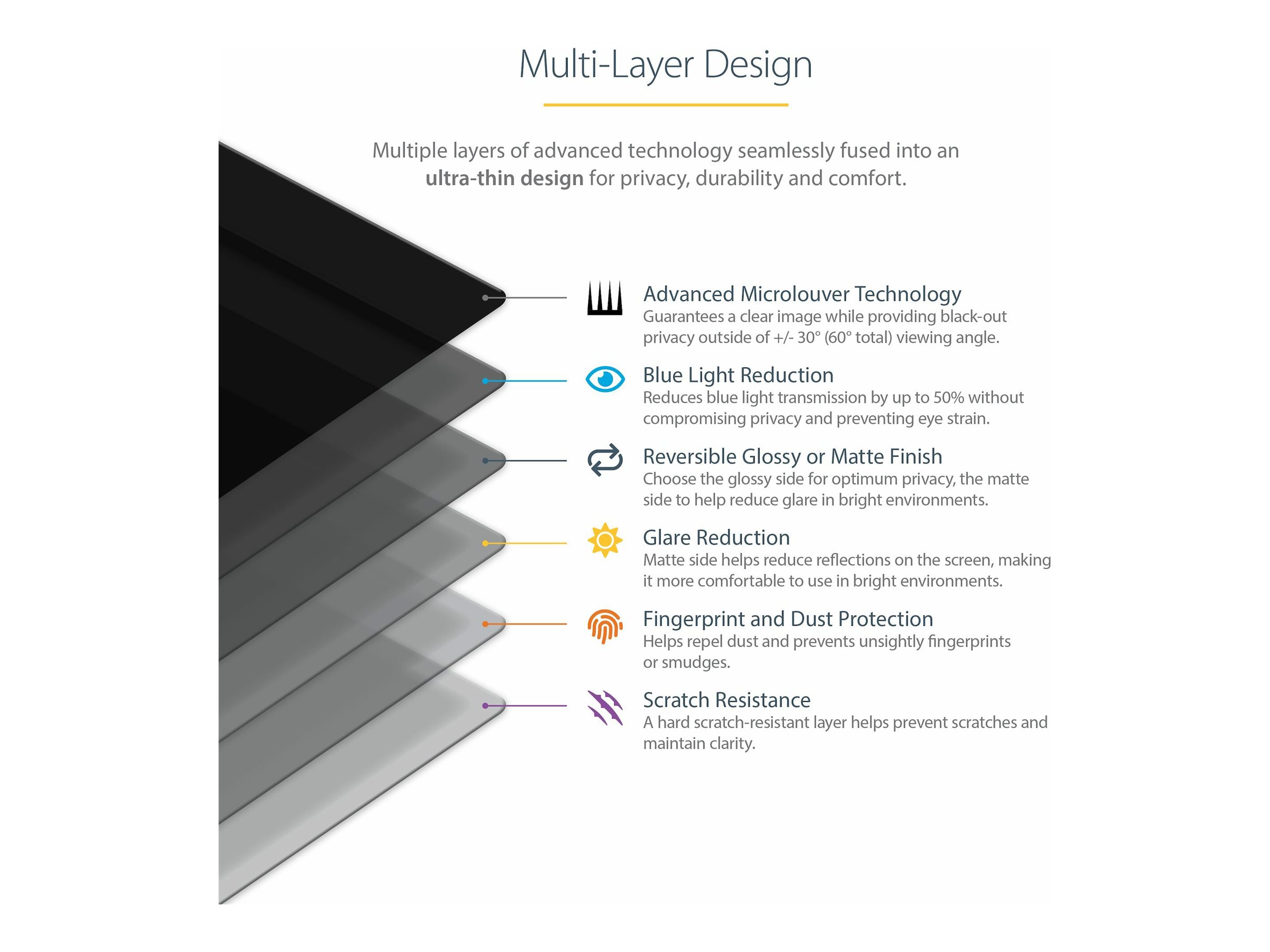 | Produktbeskrivelse | StarTech Monitor Privacy Screen for 21 inch PC Display, Computer Screen Security Filter, Blue Light Reducing Screen Protector Film, 16:9 Widescreen, Matte/Glossy, +/-30 Degree Viewing - Blue Light Filter - privacy-filter for skærm - 21,5" bred - TAA-kompatibel |