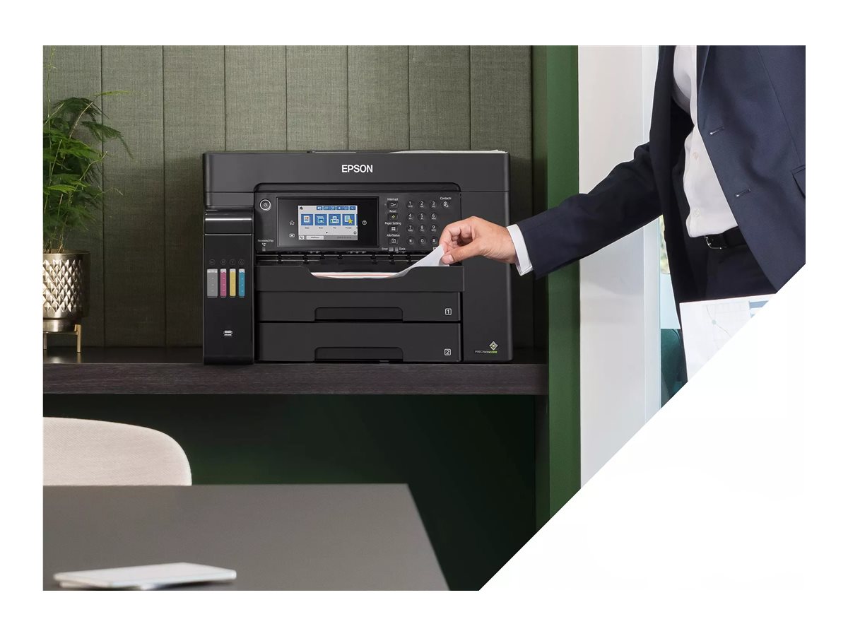 Denne højtydende A3+ multifunktions EcoTank med fax er perfekt til virksomheder og har genopfyldelige blækbeholdere til at levere udskrivning til en ultralav pris. Den omfatter en frontpapirbakke til 500 ark, en arkføder på bagsiden til 50 ark og en ADF til 50 ark. Udskriv, som du vil, med mobil udskrivning, Ethernet og en LCD-berøringsskærm på 10,9 cm med funktionstaster.