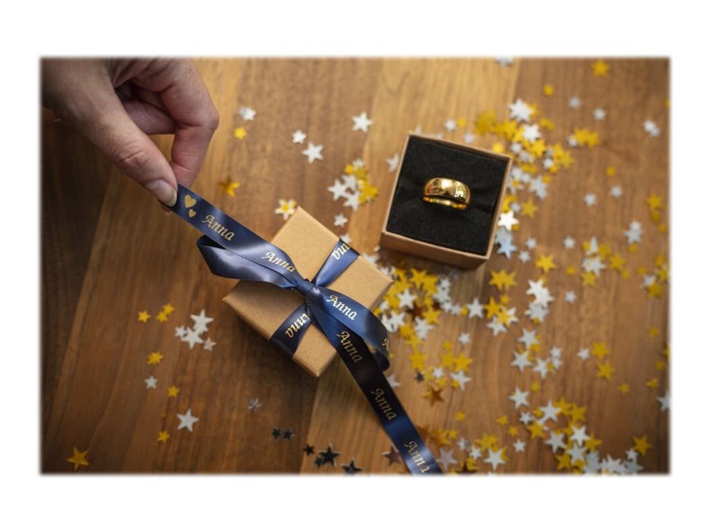Gør kort og gaver mere personlige med et TZe-RN34 satinbånd i guld og marineblå fra Brother. Uanset om der er en særlig lejlighed, eller du bare vil give lidt ekstra, er disse luksuslabels den bedste måde at gøre gaver mere personlige.