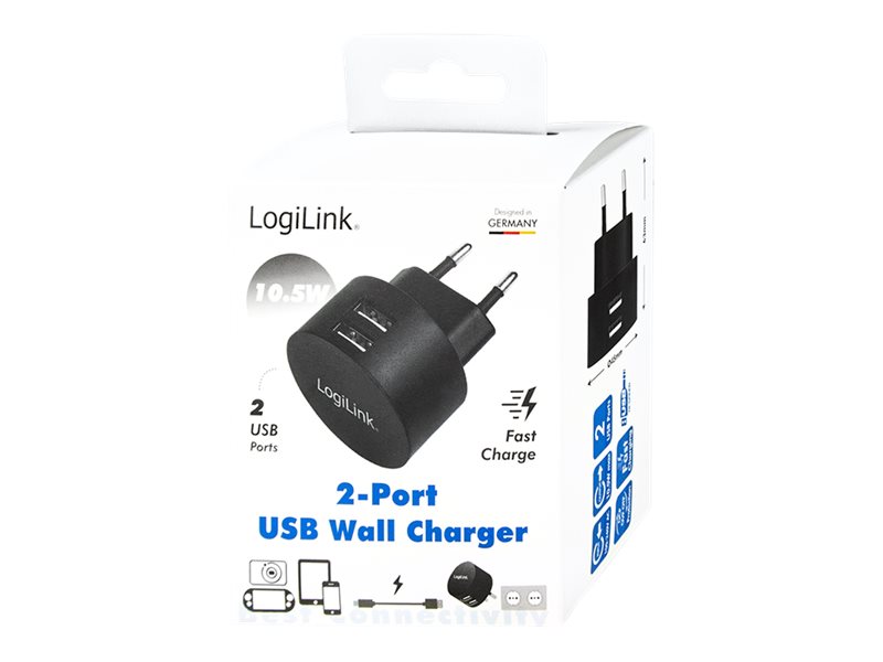 | Produktbeskrivelse | LogiLink 2-Port USB Wall Charger strømforsyningsadapter - USB - 10.5 Watt |