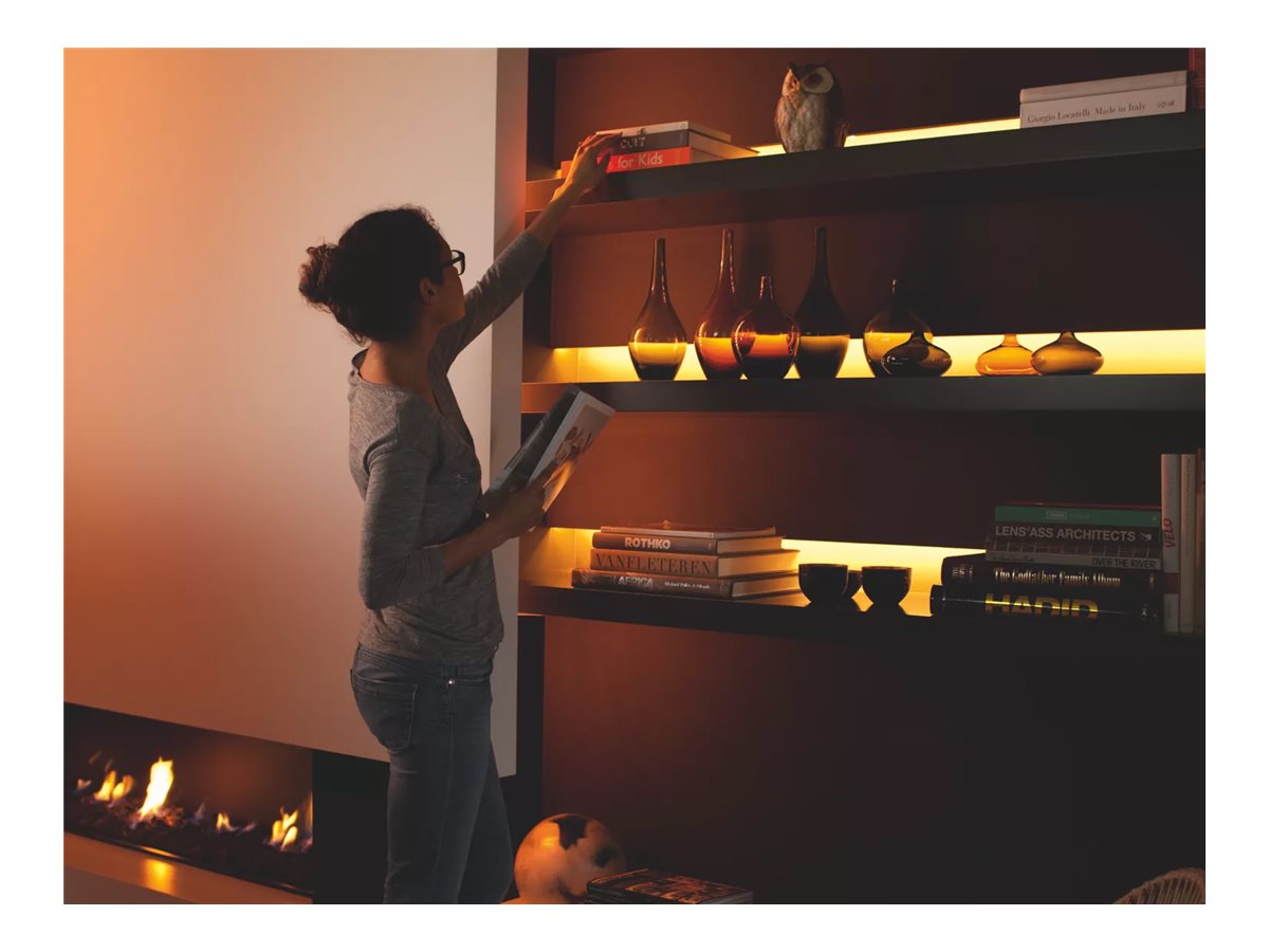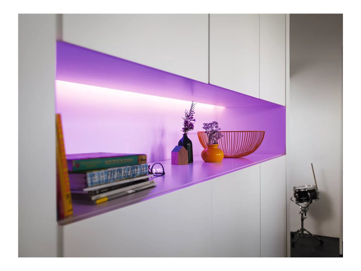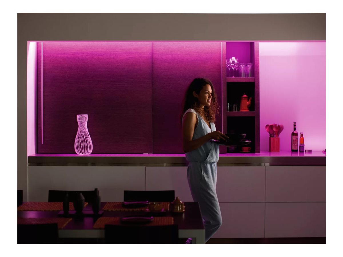 Udvid din Hue Lightstrip med Lightstrip forlænger. Fastgør det fleksible LED bånd på hvilken som helst overflade med det medfølgende klæbemateriale for at give ethvert rum farvet belysning.
