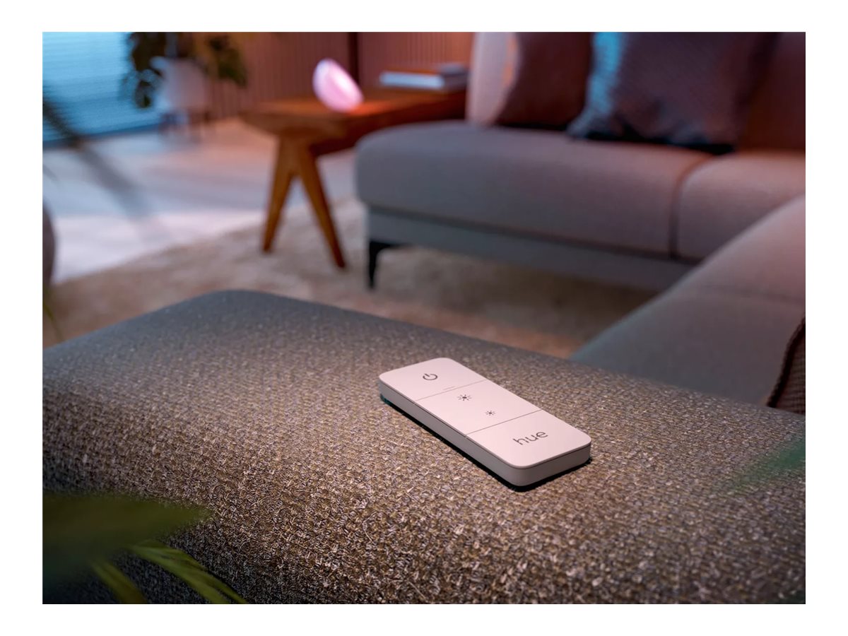 Få øjeblikkelig kontrol over din intelligente belysning fra Philips Hue med en Hue dimmer switch. Med ét tryk på en knap kan du styre lyset i hele dit hus. Dæmp eller oplys rummene, tænd og sluk for lyset eller skift mellem belysningsscener.