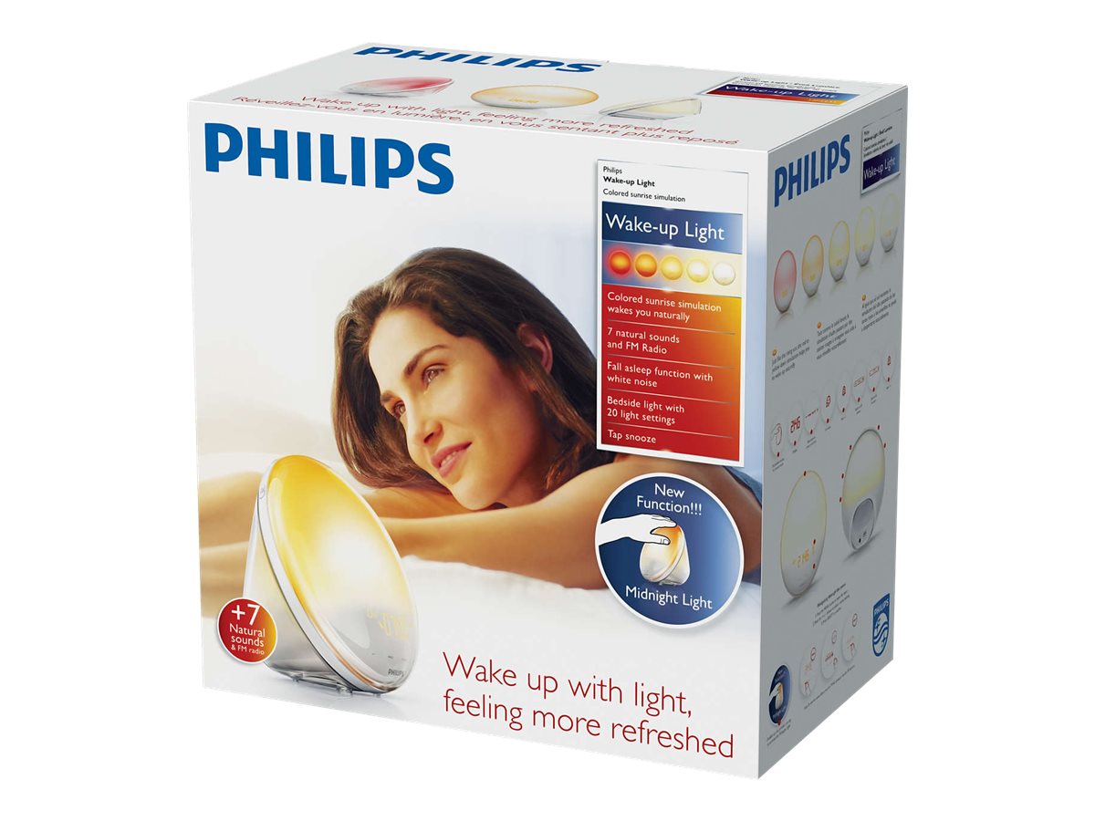 I den lange vinterperiode i Norden er det mørkt, når man vågner, og mørkt, når man kommer hjem. Det kan føles unaturligt at blive vækket af en kimende alarm i mørket, så det er ikke så underligt, at man bliver stressede og kommer i dårligt humør. Med Philips Wake-up Light vækkes du gradvist af et lys, som langsomt bliver kraftigere. Denne model har desuden 7 vækkelyde, som afslutter vækningen. Du vågner af dig selv på en behagelig måde og er mere udhvilet og mindre stresset. Ved at blive vækket af lys får du en bedre start på morgenen og mere energi resten af dagen.