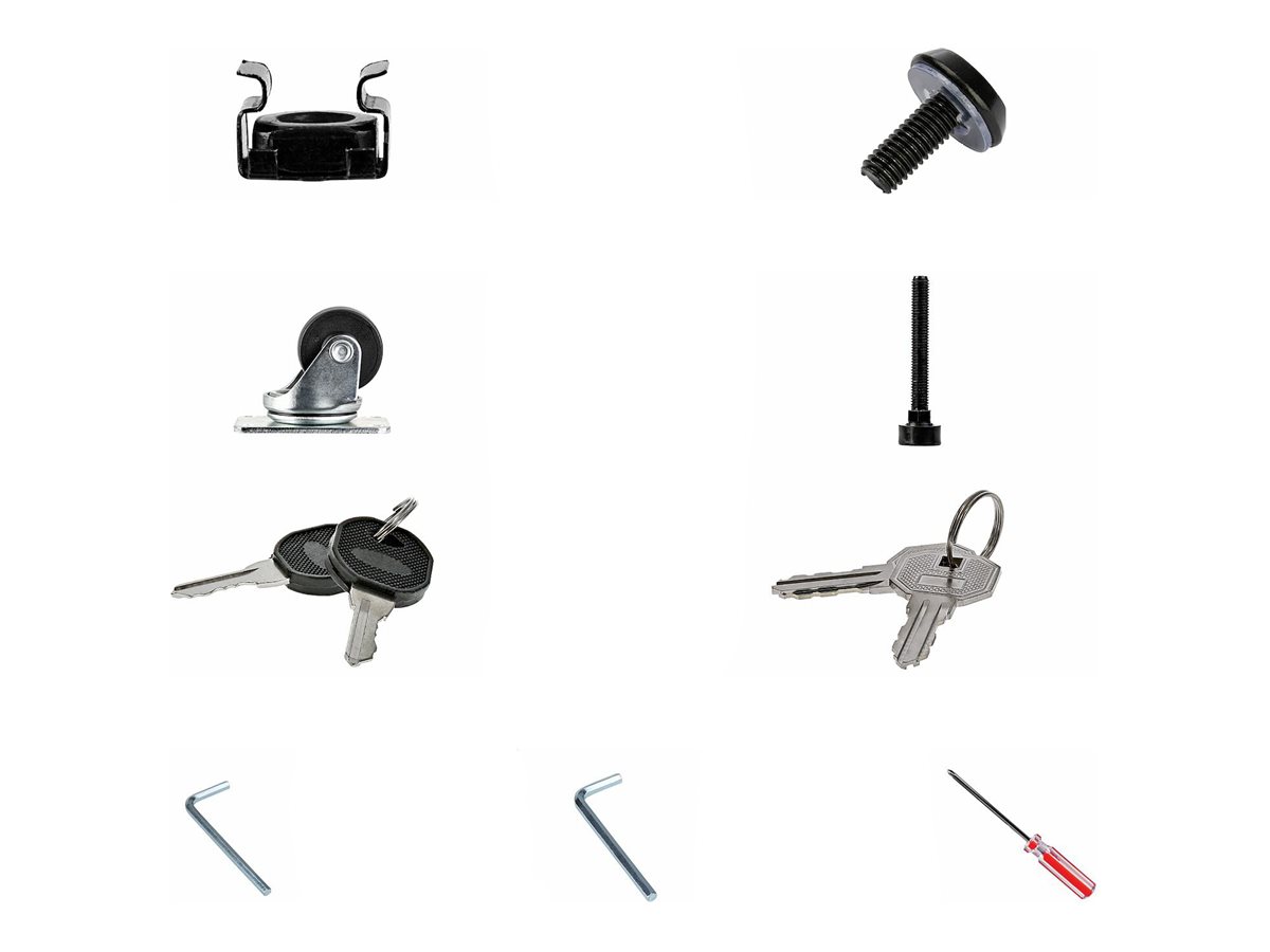 | Package Content | Phillips screwdriver, 2 casters, top panel, front door, rear door, 2 side panel keys, 2 door keys, 4 leveling feet, 24 M6 cage nuts, 2 casters with locking device, 2 side panel and frame, 4 upper and lower beams, 2 bottom panel with cable management |
