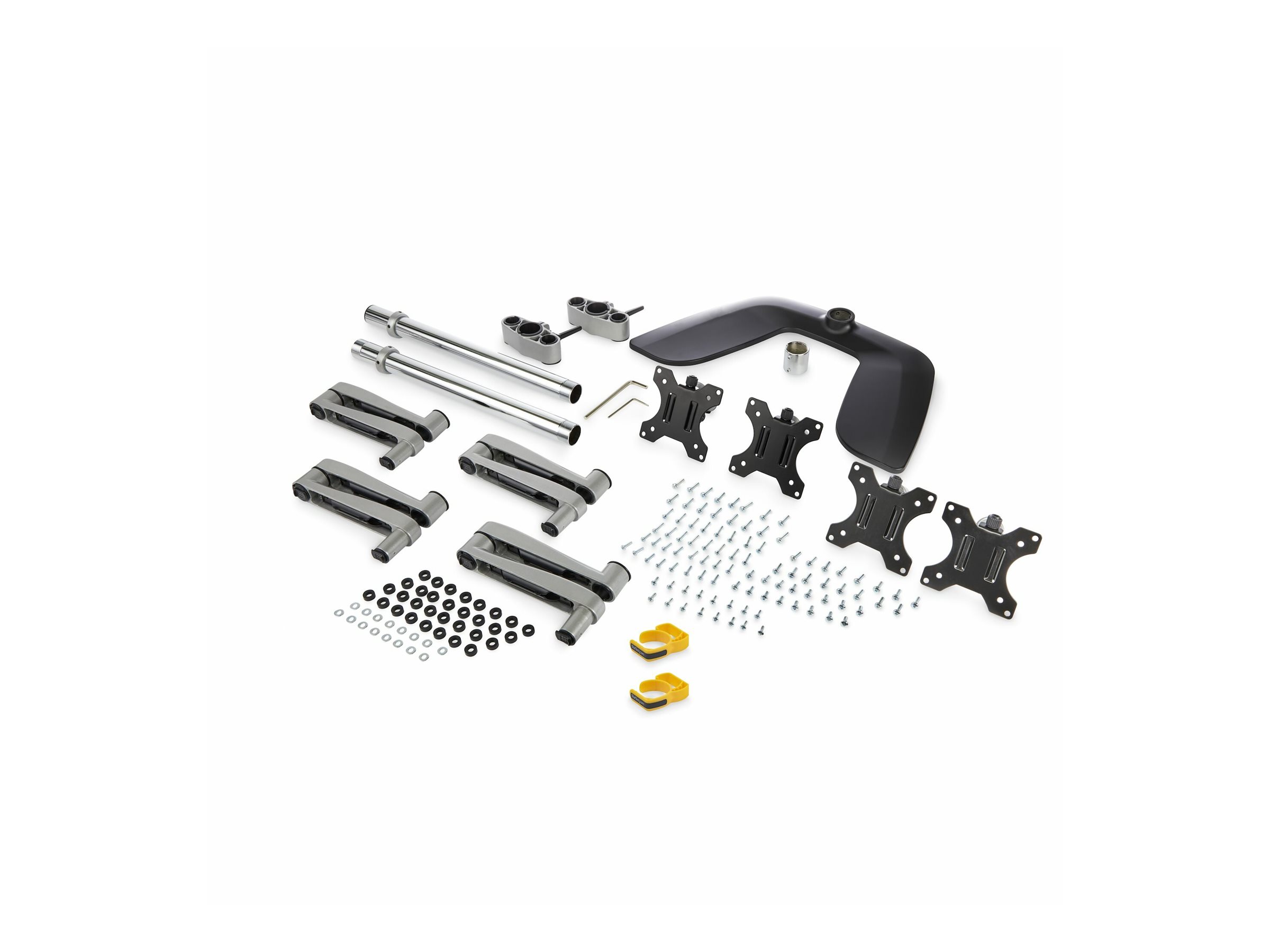 | Package Content | 16 x washers, hex key (3mm), 4 x VESA monitor mounts, hex key (6mm), 2 x cable-management clips, lower pole, base, upper pole, pole connector, 4 x swivel arms, 16 x M4x16 screws, 16 x M4x12 screws, 16 x M5x16 screws, 16 x M5x12 screws, 16 x M4x20 scr |