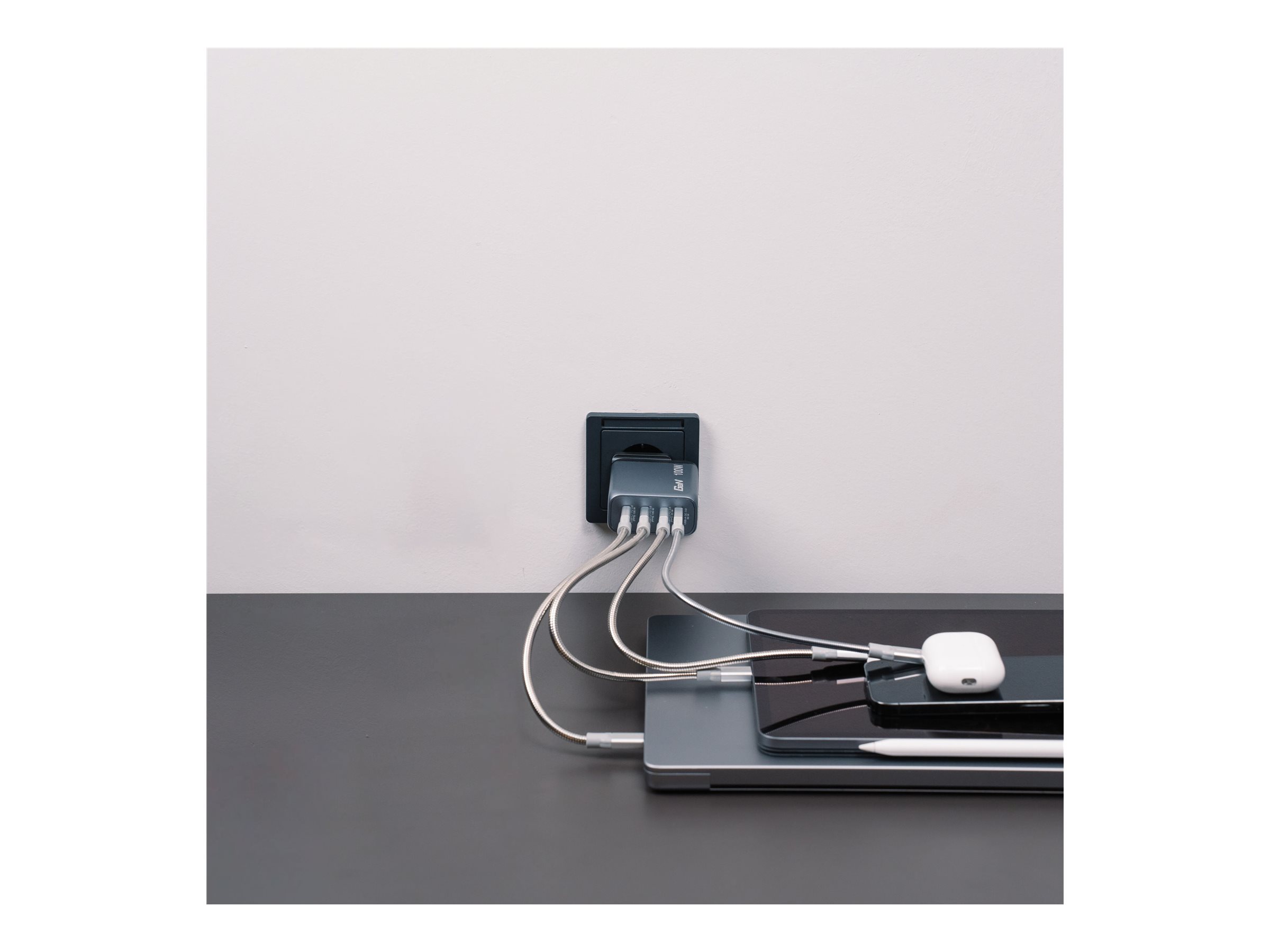 | Strømenhedsoplysninger | 2 x 24 pin USB-C with Power Delivery - 20 V - 100 W - 5 A<br>24 pin USB-C with Power Delivery - 20 V - 65 W - 5 A<br>4 pin USB Type A QC 3.0 - 20 V - 30 W - 5 A |
