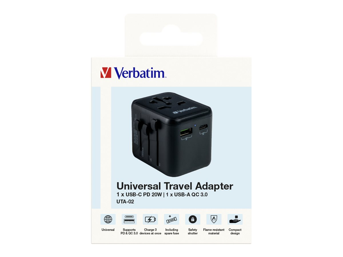 Produktbeskrivelse Verbatim UTA-02 strømforsyningsadapter - USB, BS 1362, USB-C - 20 Watt