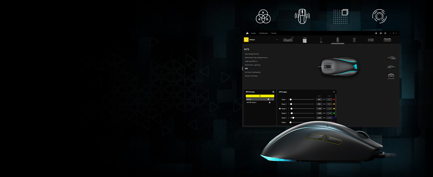 | Egenskaber | Polytetrafluoroethylene (PTFE) feet, RGB LED-bagbelysning, iCUE support, CORSAIR MARKSMAN sensor, CORSAIR QUICKSTRIKE-knapper |