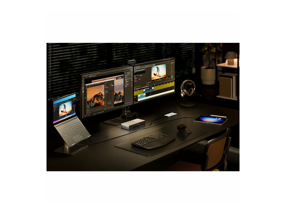 SD5000T5 EQ Thunderbolt 5-dockingstationen er designet til professionelle, der kræver den højeste ydeevne. SD5000T5 er kompatibel med Windows og macOS og øger effektiviteten i arbejdsgangen med lynhurtige dataoverførsler på 80 Gbps – og op til 120 Gbps til videointensiv brug via Bandwidth Boost. Den understøtter op til tre 4K-skærme ved 144 Hz eller to 8K-skærme ved 60 Hz, hvilket sikrer billeder i høj kvalitet og problemfri multitasking. Løsningen med ét kabel leverer op til 140 W strømforsyning til din bærbare computer og eksterne enheder – og understøtter effektivitet med lav latenstid og mindre kabelrod. Med 3 x Thunderbolt 5 downstream-porte, 1 x Thunderbolt 5-vært, 3 x USB-A 3.2 Gen2 Gbps-porte, et lydstik, dobbelt SD-/Micro-kortlæsere og 2,5 Gbps Ethernet maksimerer denne dockingstation produktiviteten med banebrydende teknologi. Aluminiummet i dette produkt indeholder 100 % genanvendt aluminium (PCR / post-consumer recycled)*. Den inkluderer Kensington DockWorks -software og understøttes af en 3-års begrænset garanti. * Yderdelen af dockingstationen er fremstillet af aluminium, undtagen PCB-enheden og eventuelle, relaterede indvendige komponenter.