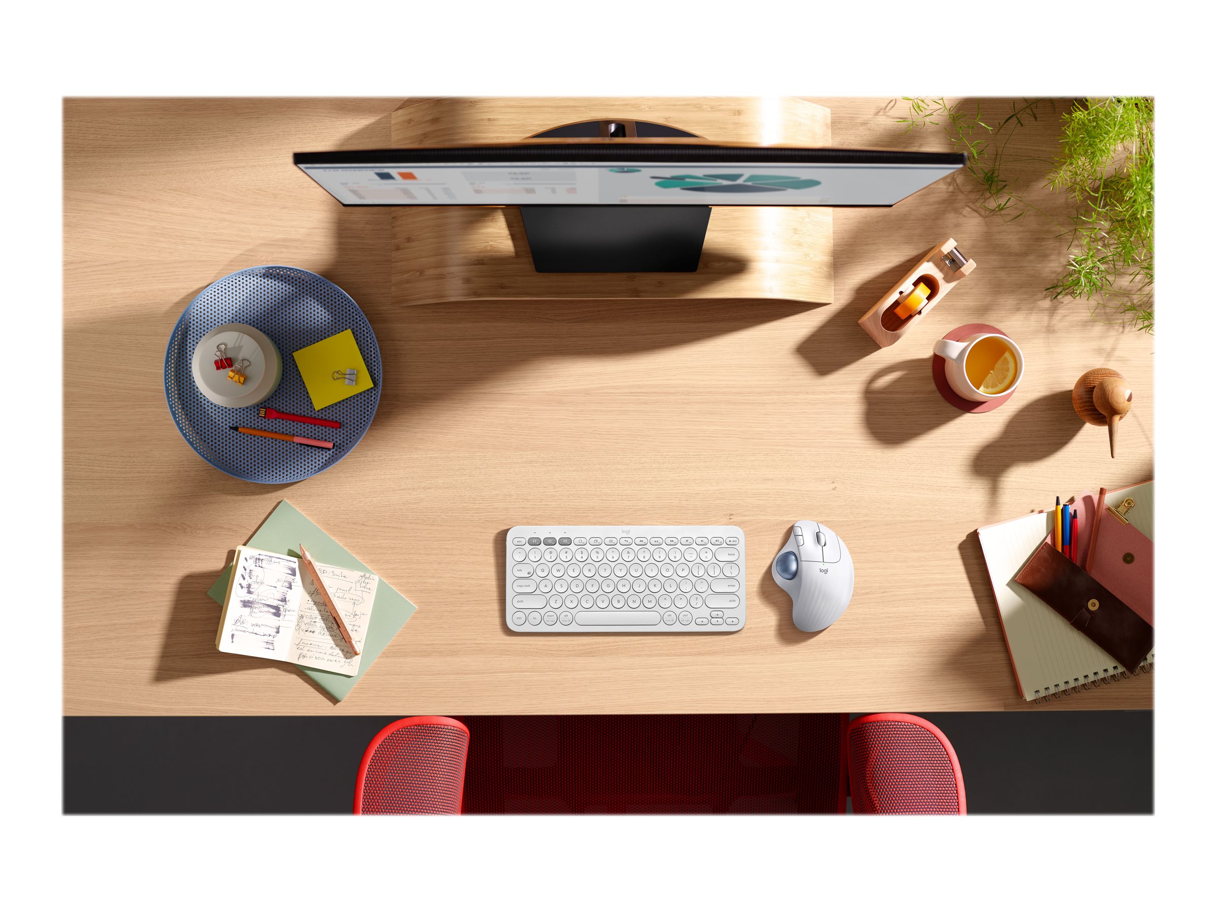 Arbejd behageligt overalt Denne kompakte opsætning har de værktøjer, som du har brug for til en hel dag med komfort og bedre produktivitet – fra et minimalistisk tastatur og en trackball til det helt rigtige webkamera og trådløse headset, som føles fantastisk under opkald