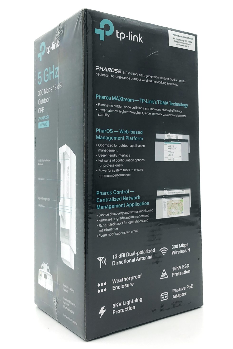 CPE510 er også udstyret med centraliseret administrationssoftware, der hjælper brugerne med nemt at administrere alle enhederne i deres netværk fra en enkelt pc - Pharos Control. Funktioner som enhedsopdagelse, statusovervågning, firmwareopgradering og netværksvedligeholdelse kan administreres ved hjælp af Pharos Control.