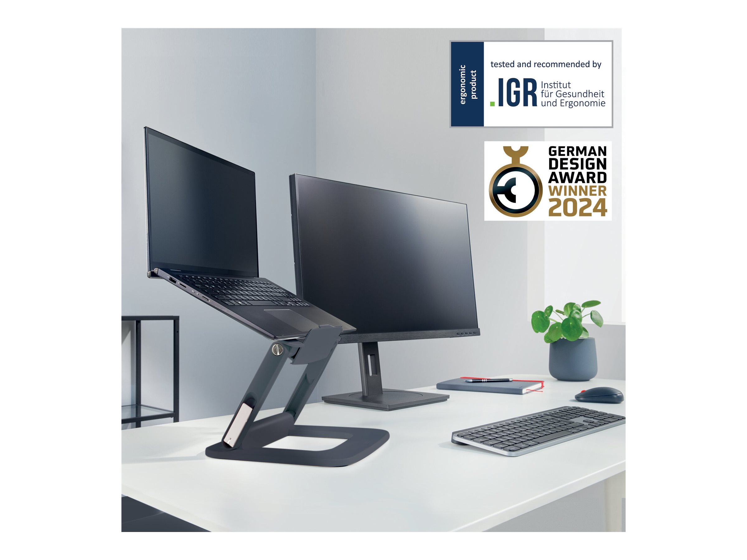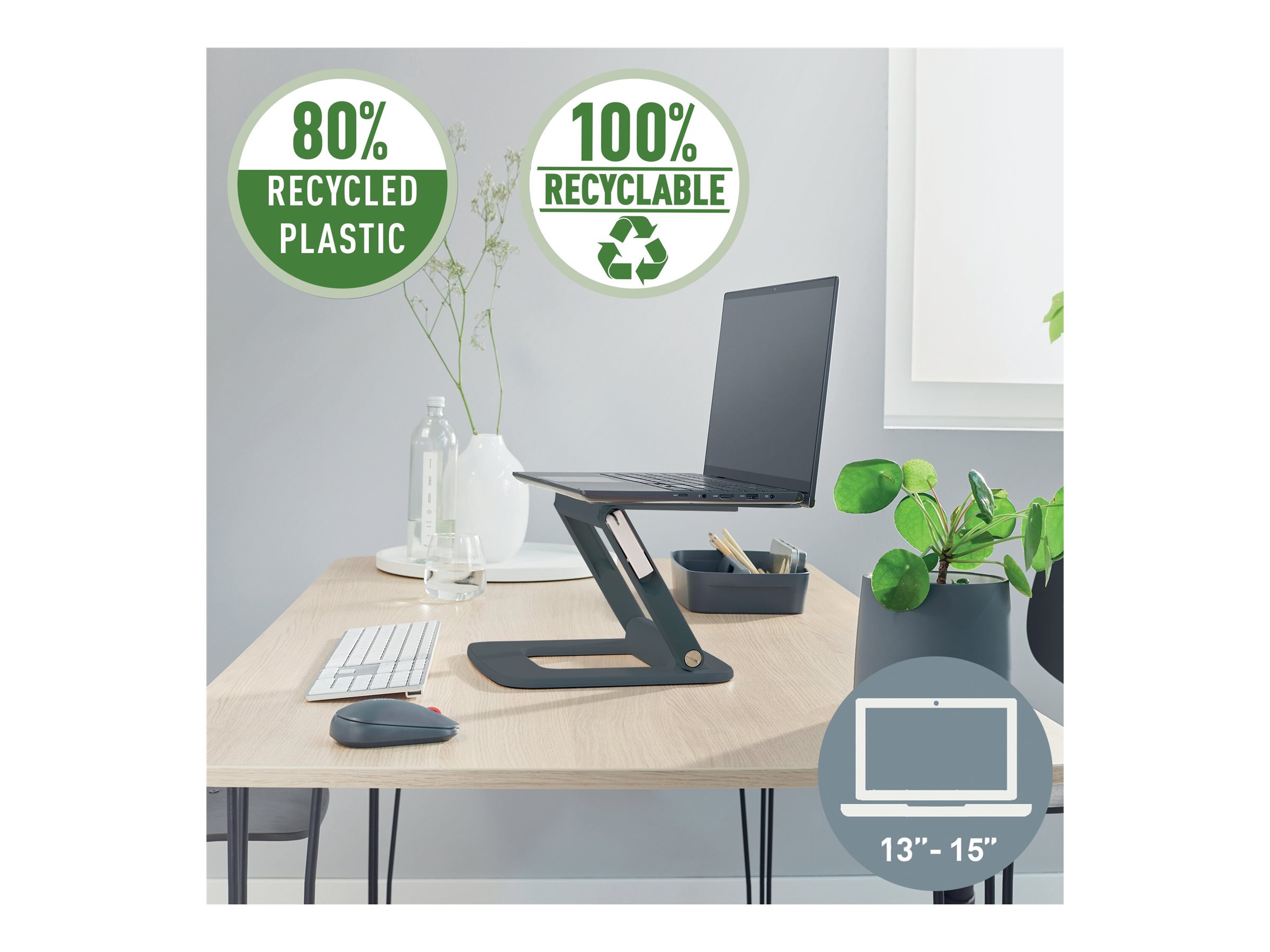 Dette stativ er fremstillet af 80 % genbrugsplast og understøtter dine ergonomiske behov og bidrager positivt til miljømæssig bæredygtighed.