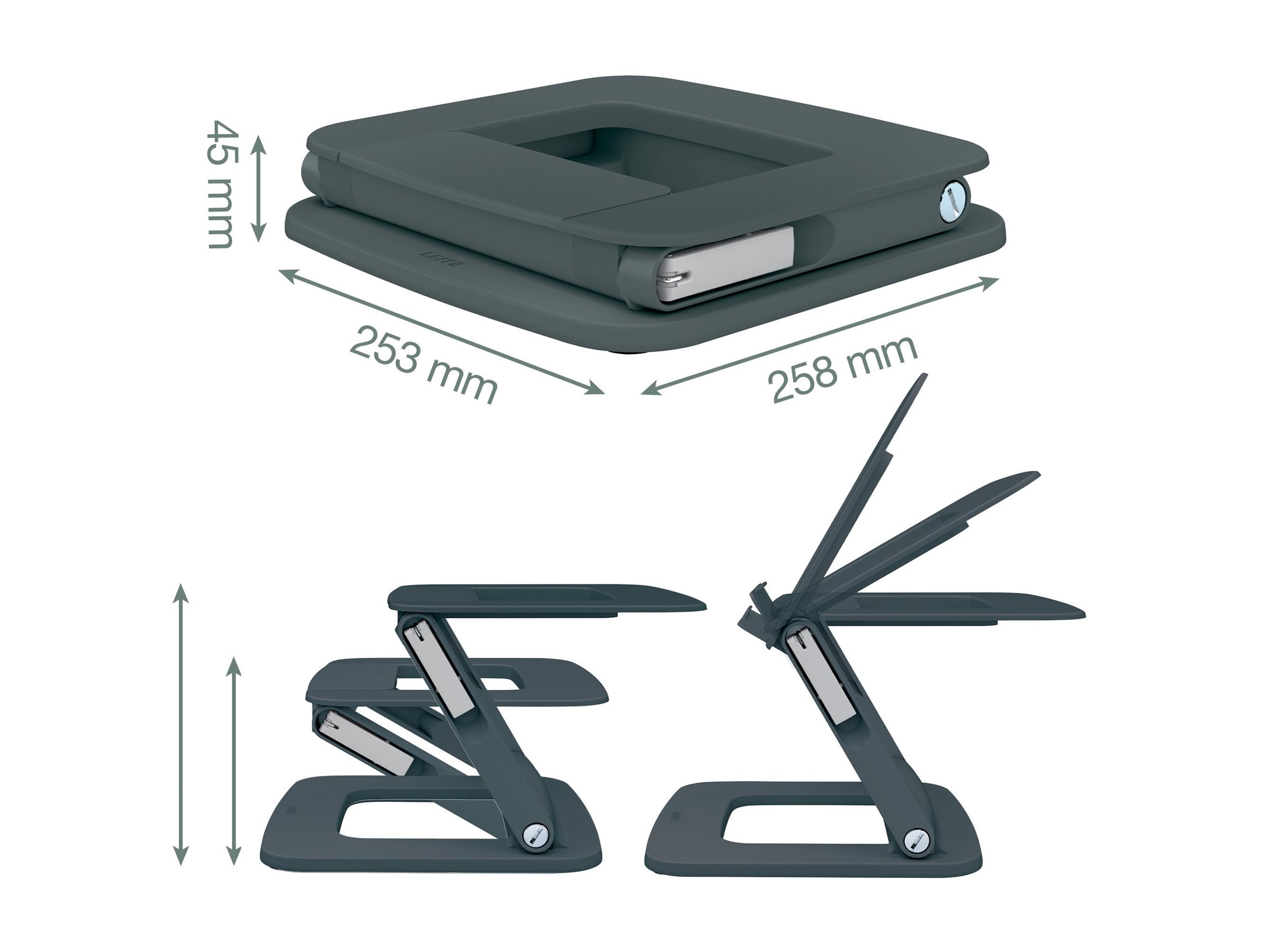 Leitz Ergo multivinklet laptop stand hæver skærmen på din laptop til den perfekte ergonomiske højde, for at øge din visningskomfort og hjælpe med at forbedre din kropsholdning. Forskellige højde- og vinkelkombinationer, herunder horisontal tilpasning for et lille aftryk til kompakte skriveborde. Produktet er fremstillet af 80 % recirkuleret plast og kan skilles ad ved at adskille metaldele fra plast, så det kan recirkuleres 100 % - høj kvalitet og lang holdbarhed. Ved at bruge en laptop stand kan du også fremme luftstrømmen og dermed holde batteriet og andre komponenter kølige, så du kan opretholde et højt ydelsesniveau. Med sit minimalistiske design og matte finishfarve vil denne stilfulde laptop stand forbedre sundhed og velvære, ved ubesværet at skabe den perfekte aktive arbejdsopsætning. Kombiner med andre Leitz Ergo produkter for at skabe en indbydende og fleksibel arbejdsplads, der holder dig i bevægelse hele dagen.