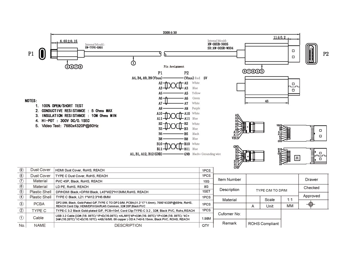 Vision TC 2MUSBCDP8K/BL har et venstre USB-C-stik med 24 ben og et højre DisplayPort-stik med 20 ben, der er designet til at give stabile forbindelser til alle dine skærmbehov.
