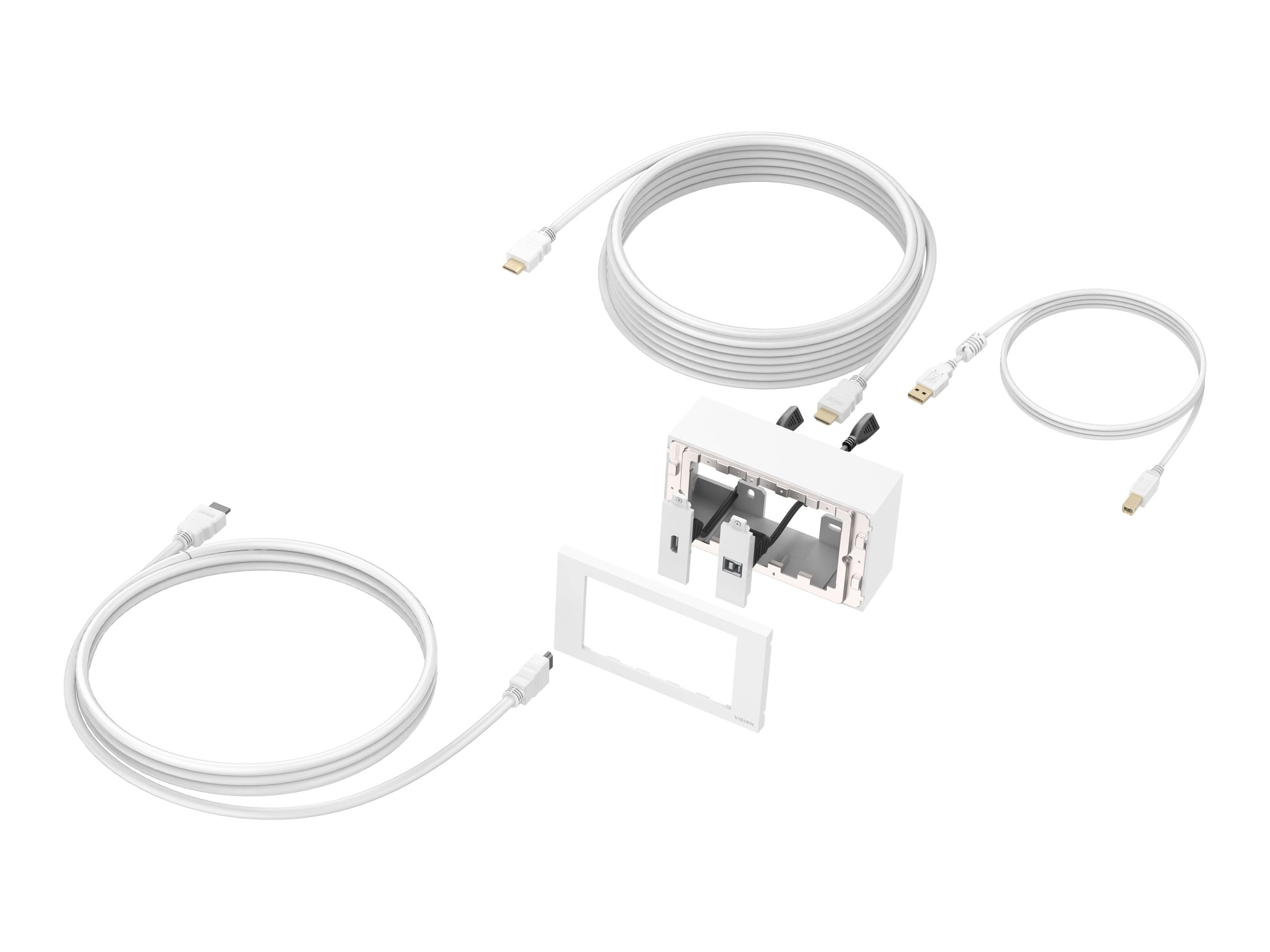 | Pakke Indhold | 1 x 2-Gang UK Backbox, 1 x 2-Gang Surround, USB kabel (3 m), 1 x USB (B-type foran) snap-in modul, 1 x HDMI Modul, 3 blanke paneler, 2 x HDMI-kabel (3 m) |