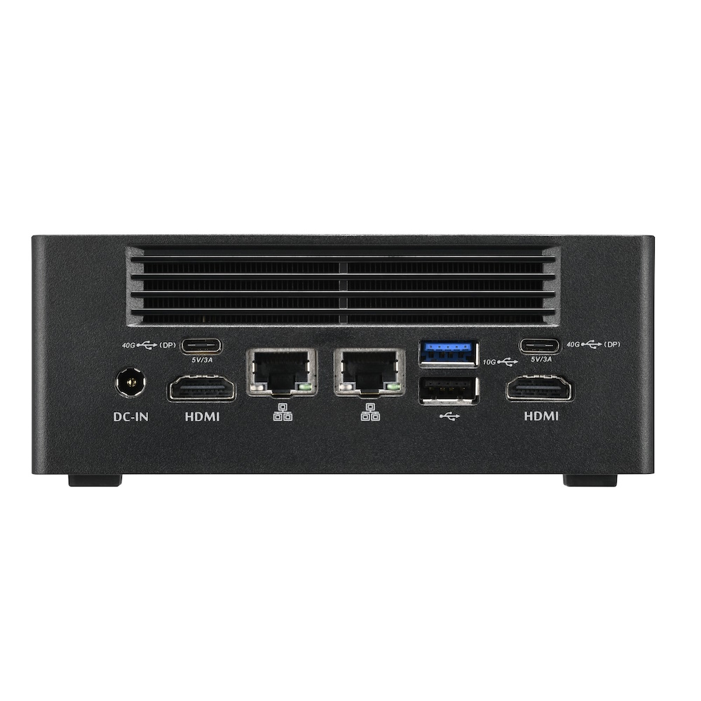 | Back Panel connectors | 2x HDMI 2.0, 2x USB4 Type-C (max. 40 Gbps) with DP-Alt mode (DP 1.4) and PD (max. 5V / 3A), 1x USB 3.2 Gen 2 Type A (max. 10 GBit/s), 1x USB 2.0, 2x 2.5G Ethernet LAN (RJ45, Realtek RTL8125B), 1x DC-input (5,5 / 2,5 mm) |