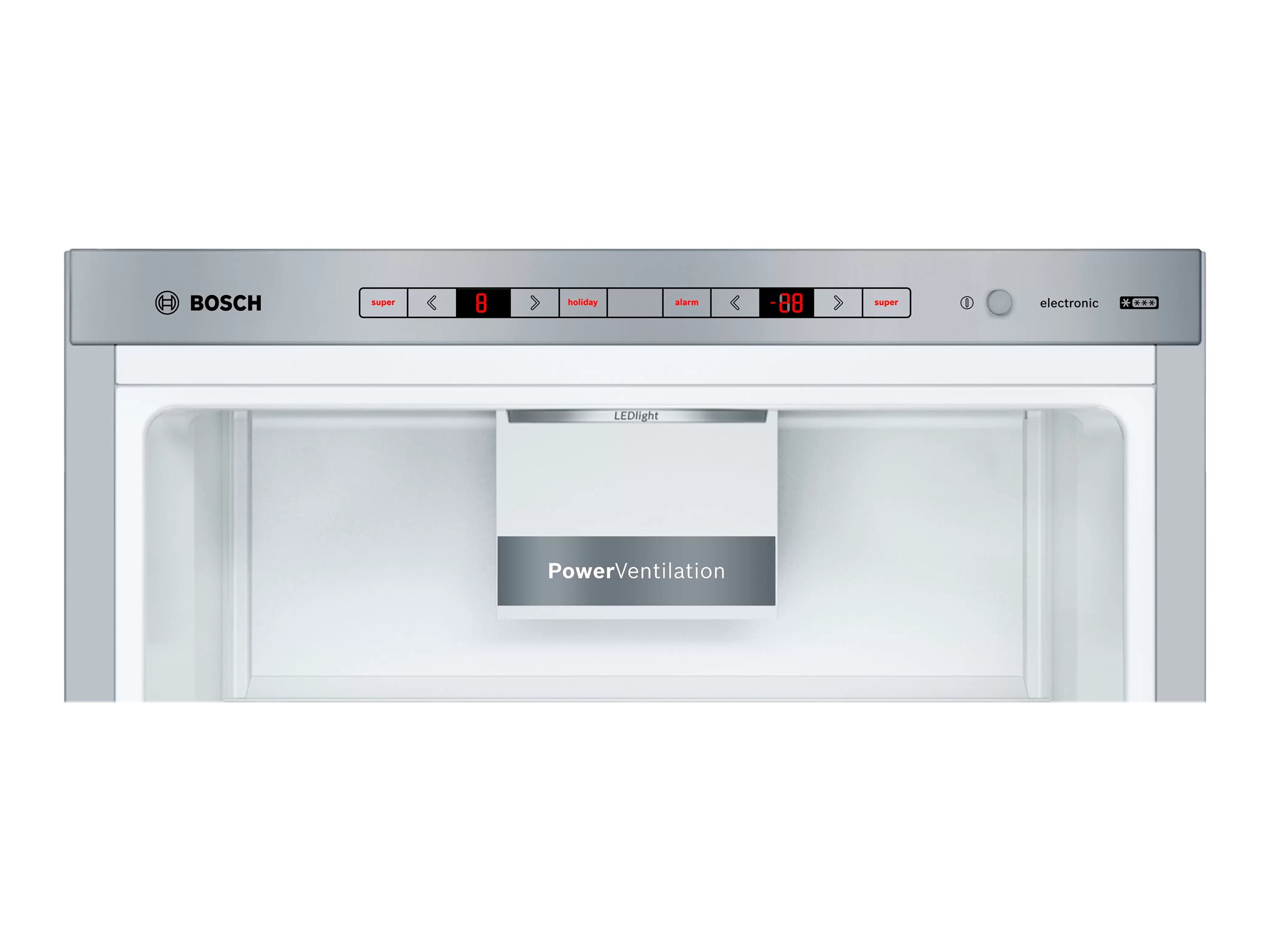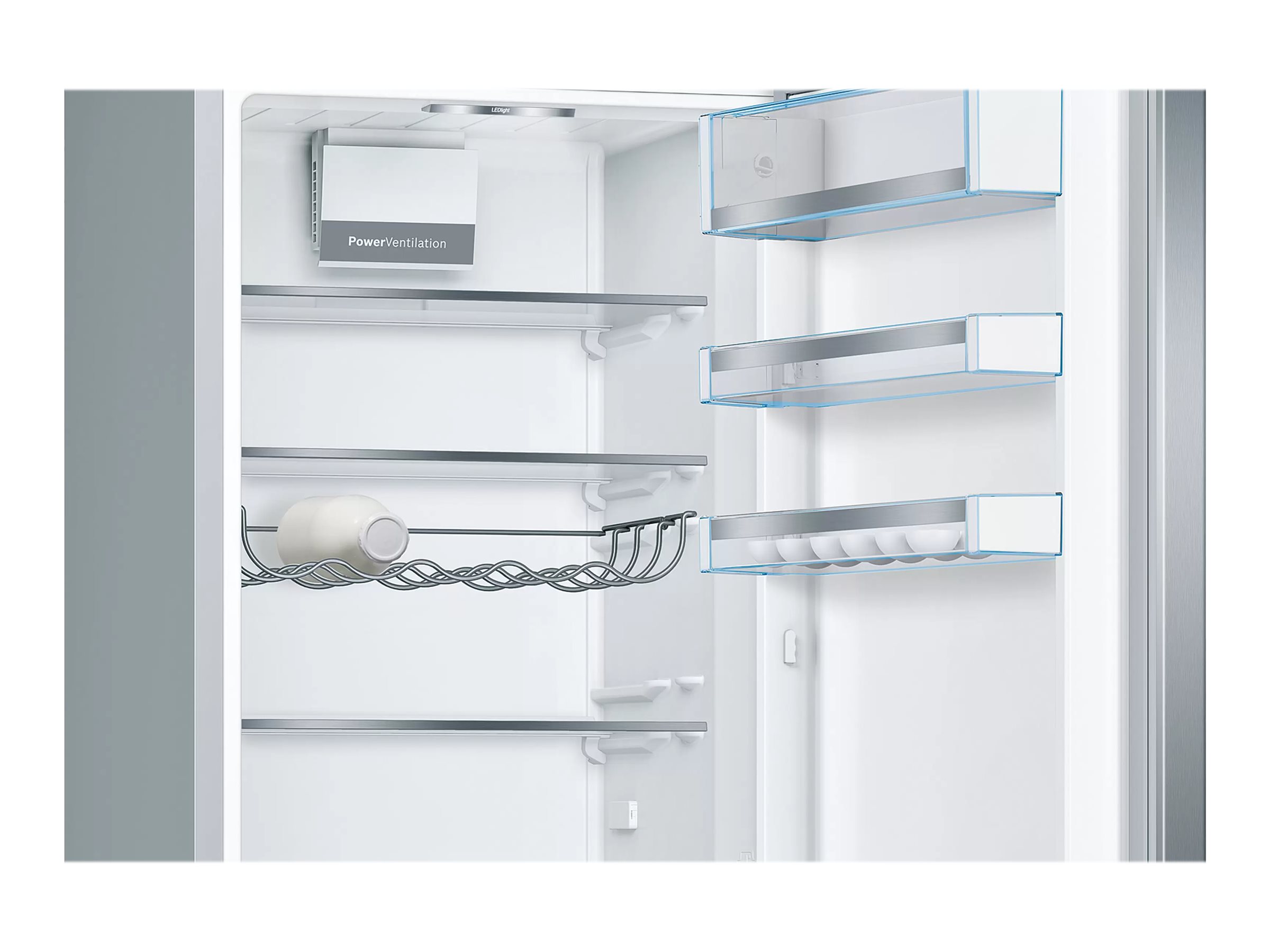 Med det eksklusive Bosch PowerVentilation-system går luftcirkulationen i køleskabet nu fra top til bund, langs bagvæggen, hvor kulden kommer fra. PowerVentilation-systemet aktiveres samtidig med kompressoren for at sikre en perfekt fordeling af kulden. Resultatet er, at maden afkøles hurtigere, rumtemperaturen er mere jævn, og fugtighedsniveauet er optimalt.