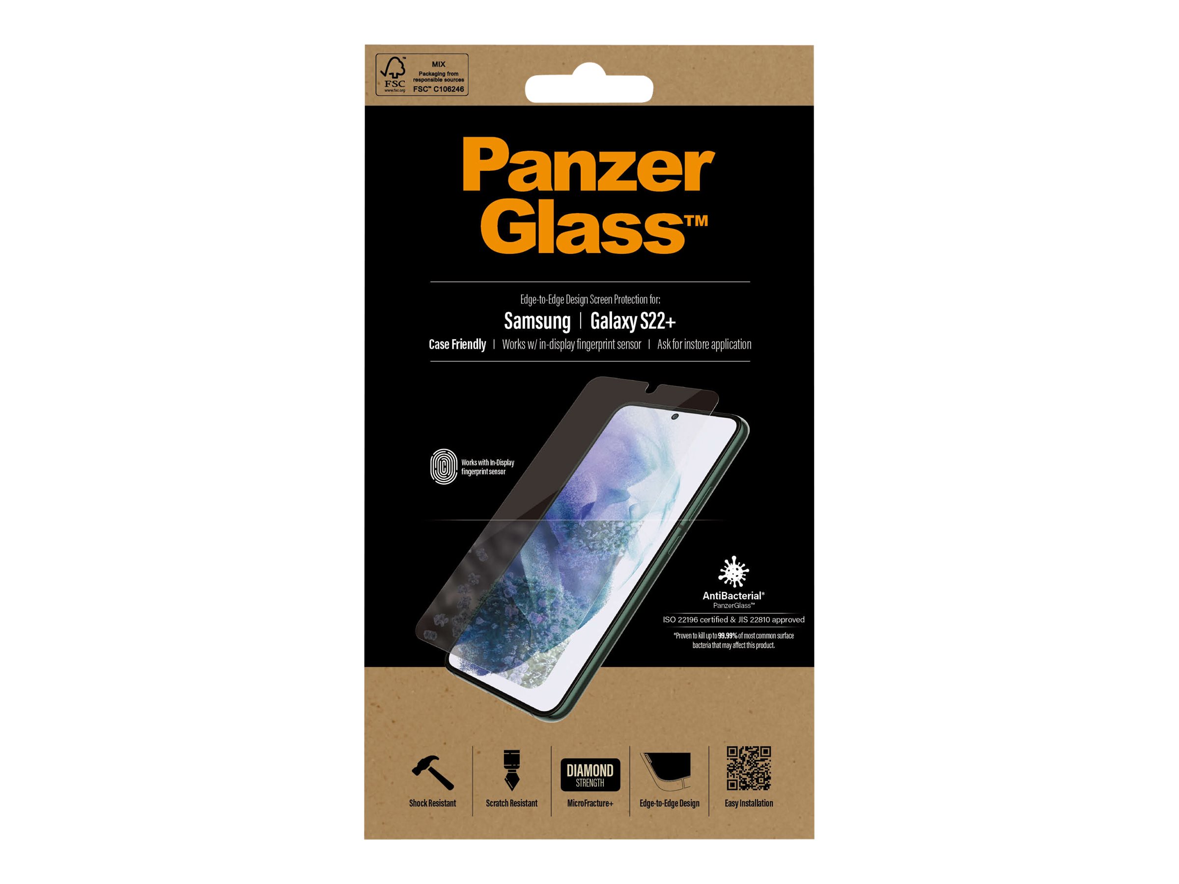 Denne originale skærmbeskyttelse fra PanzerGlass er specialdesignet til Samsung Galaxy S22, beskytter din telefon mod hverdagens udfordringer og understøtter specifikke S22-funktioner som fx hurtig og nøjagtig fingeraftryksgenkendelse, så du kan få mest muligt ud af din enhed.Det hærdede glas beskytter din telefon mod utilsigtede stød, skarpe kanter og voldsomme tab på stenhårde fortove. Skærmbeskyttelsen har endda en fingeraftryksafvisende overfladebehandling med antibakteriel effekt, der reducerer spor af fedtfingre og dræber op til 99,99 % af alle almindelige overfladebakterier. Skærmbeskyttelsen dækker hele skærmen fra kant til kant og er designet til at fungere sammen med de fleste covers. Det er let at sætte på og leveres i genanvendelig, FSC -mærket emballage.