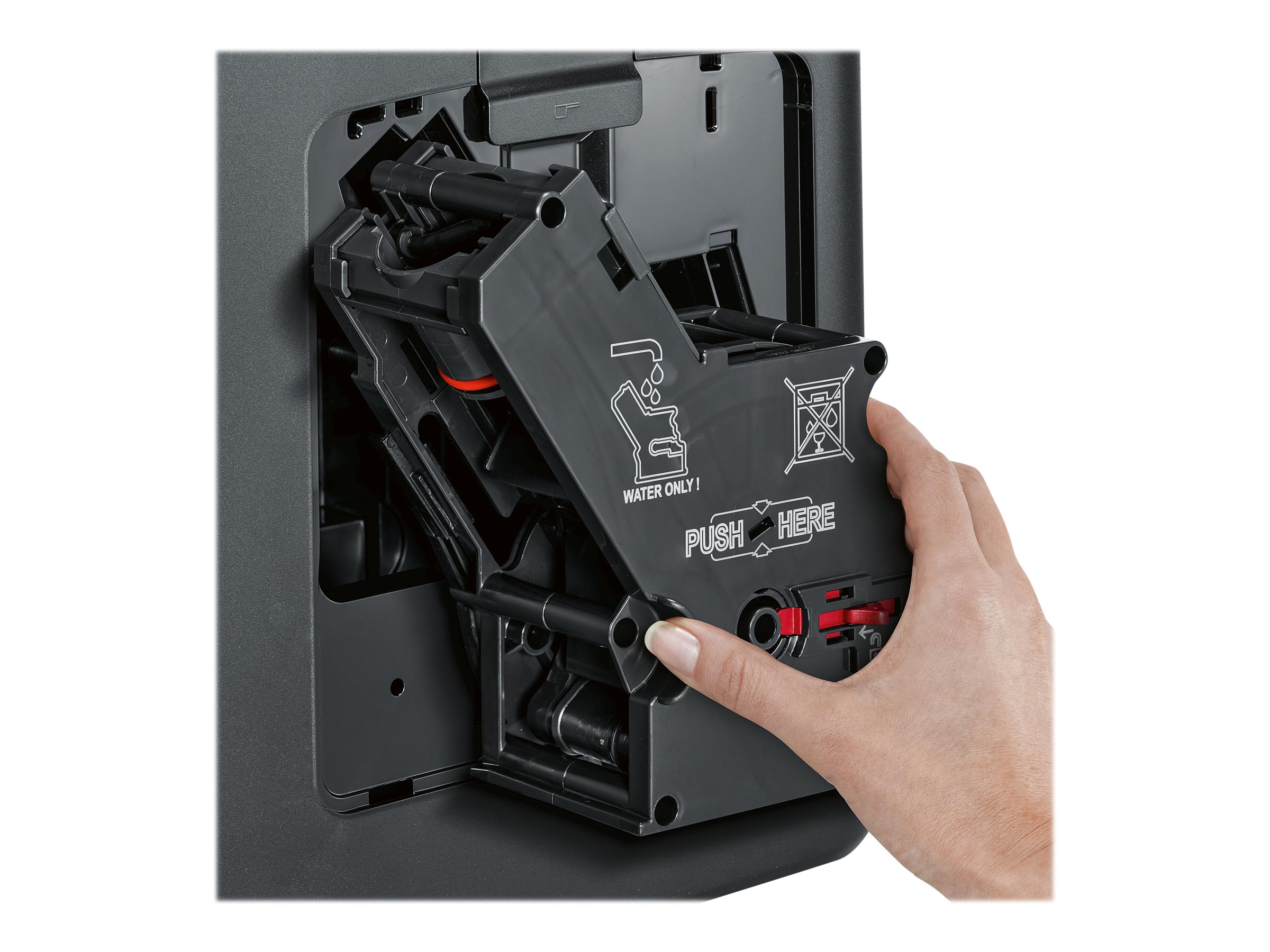 | Medföljande tillbehör | Testremsa för vattenhårdhet, mätsked, Brita Intenza-filterpatron, mjölkrör, termisk mjölkbehållare |
